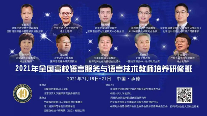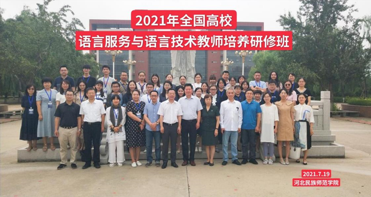 2021年7月18日-21日,2021年全国高校语言服务与语言技术教师培养研修班成功举办。本次研修班由中国语言服务40人论坛、北京语言大学国际语言服务研究院主办,中国语言服务40人论坛研修班组委会、河北民族师范学院外国语学院、语服信息技术研究院(北京)有限公司承办,中国人民大学出版社、河北民族师范学院语言服务研究所、对外经济贸易大学国际语言服务与管理研究所、广西翻译协会语言服务委员会协办,贯彻落实了教育部关千新文科建设的重要指示精神, 面向国家战略和社会需求重新定位外语学科、 充实内涵、 创新学科体系, 顺应互联网和人工智能时代新发展, 大力培育外语新兴学科, 培养跨学科和复合型的高素质外语人才。