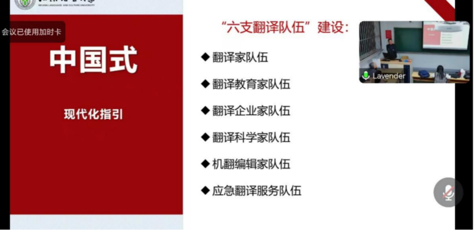 王立非教授分享了北京语言大学在新兴学科“国际语言服务”方面的学术研究和实践探索成果,并提出要着力培养六类翻译人才、强化三种翻译精神教育、构建三个自主翻译创新体系、提升三种翻译服务能力。