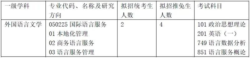 2021年8月20日教育部学位管理与研究生教育司批准“国际语言服务”依托外国语言文学一级学科成为自主增设的二级学科。依托国家语言服务出口基地、高级翻译学院、新闻传播学院,于2022年起开始招收和培养国际语言服务专业研究生。目前已招收国际语言服务首批研究生5人。