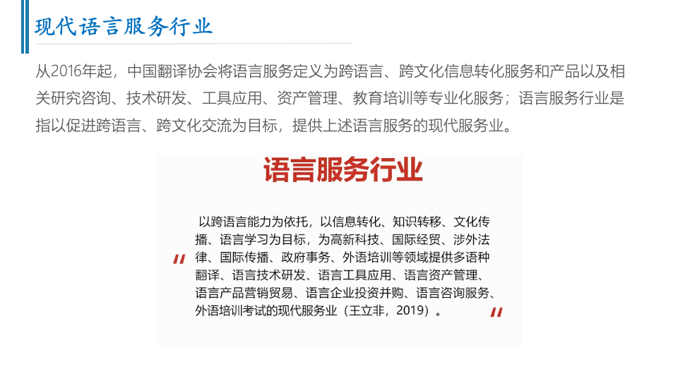 大家也许对翻译行业比较熟悉,对语言服务行业这个概念比较陌生。从2016年起,中国翻译协会定义了新的语言服务行业,他们将语言服务定义为跨语言、跨文化信息转化服务和产品以及相关研究咨询、技术研发、工具应用、资产管理、教育培训等专业化的服务,语言服务行业是指以促进跨语言、跨文化交流为目标,提供上述语言服务的现代的服务业。在北语我们现在也成立了国家级的语言服务出口基地,在我们的基地里面我们有这样的定义,我们基地的主任王立非教授是这样来定义语言服务行业的。他认为以跨语言能力为依托,以信息转换、知识转移、文化传播、语言学习为目标,为高新科技、国际经贸、涉外法律、国际传播、政府事务、外语培训等领域提供多语种翻译、语言技术研发、语言工具应用、语言资产管理、语言产品营销贸易、语言企业投资并购、语言咨询服务、外语培训考试的是现代服务业。