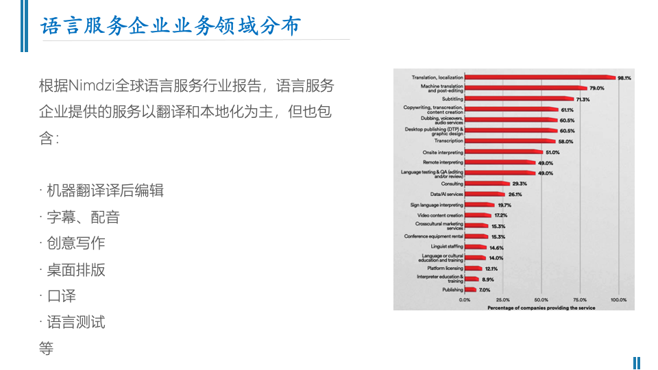 在语言服务企业实际的业务中我们也可以看到,根据Nimdzi全球语言服务行业报告,语言服务企业提供的服务实际上已经不仅仅限于翻译和本地化了,比如他们现在做的服务里面包括着机器翻译的译后编辑,包括字幕和配音,包括创意的写作,包括桌面排版,包括口译,还有语言测试等等。