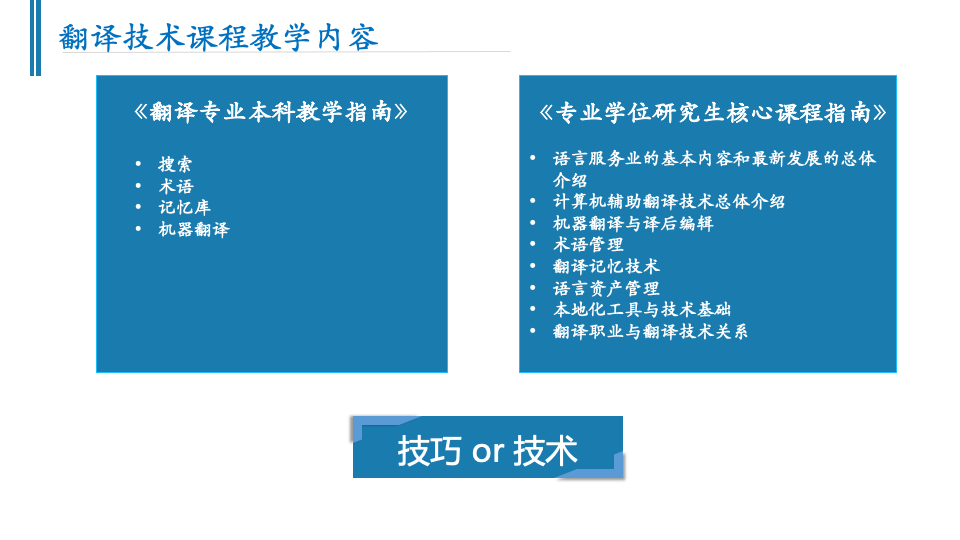可喜的是在前几年发布的翻译专业本科教学指南和专业学位研究生核心课程指南里面,已经提出来要将翻译技术和计算机辅助翻译这样的课程,纳入到翻译专业本科和翻译专业硕士的核心课程里面,纳入之后他们要教什么呢?比如说在翻译专业本科教学指南里面,认为应该让我们的学生学会如何去互联网上进行跨语言的搜索,如何让我们的学生学会术语的管理,如何让我们的学生去做翻译记忆的管理,如何让我们的学生去理解翻译技术的原理,比如说机器翻译的原理,并且去推动机器翻译和自己的翻译学习相结合。