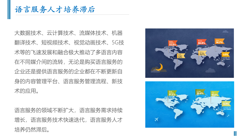 语言服务的需求持续的增长,很多人在思考说机器有没有替代人工翻译的时候,其实忽略了一个现实,就是大数据技术等等这些新的技术在推动着更多的内容出现在我们的身边,所以事实上我们语言服务的需求是在不断的增长的。有需求就会有技术的更迭,新的语言服务的技术也和传统的技术发生了一些微妙的差别。比如说当我们还在去关注是不是要去使用翻译记忆术语这样的传统的技术的时候,其实有许多的企业已经更进一步,他们将机器翻译、内容管理、翻译项目管理、本地化项目管理等等技术和自己的传统的语言服务技术相结合,他们并没有抛弃,而是在对它进行升级。可是当这些技术、这些企业都在升级改良的时候,我们的语言服务人才的培养事实上还是滞后的。