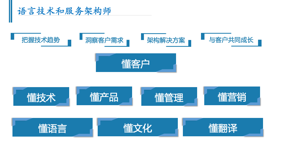 在这样的培养模式之下,我们能够培养出怎样的人才呢?我想这就是我们今天特别想向大家介绍的一个新的工作的工种,叫语言技术与服务架构师,也许这个概念在未来还会有新的称呼,但是在我们的人才培养过程中,我们是这样来定义语言技术和服务架构师的。我们希望我们的学生能够懂语言、懂文化、懂翻译,这是作为一个语言专业学生必须要具备的基本的语言素养,所以我们并没有去抛弃一个传统的语言专业学生应该具有的核心的素养。但是在这样的一个核心素养的衬托之下,我们的学生还需要进一步的去学习技术的原理、产品如何设计、项目如何管理、一个企业如何来进行营销,这些是一个出海的企业强烈需要也必须拥有的人才的核心技能。