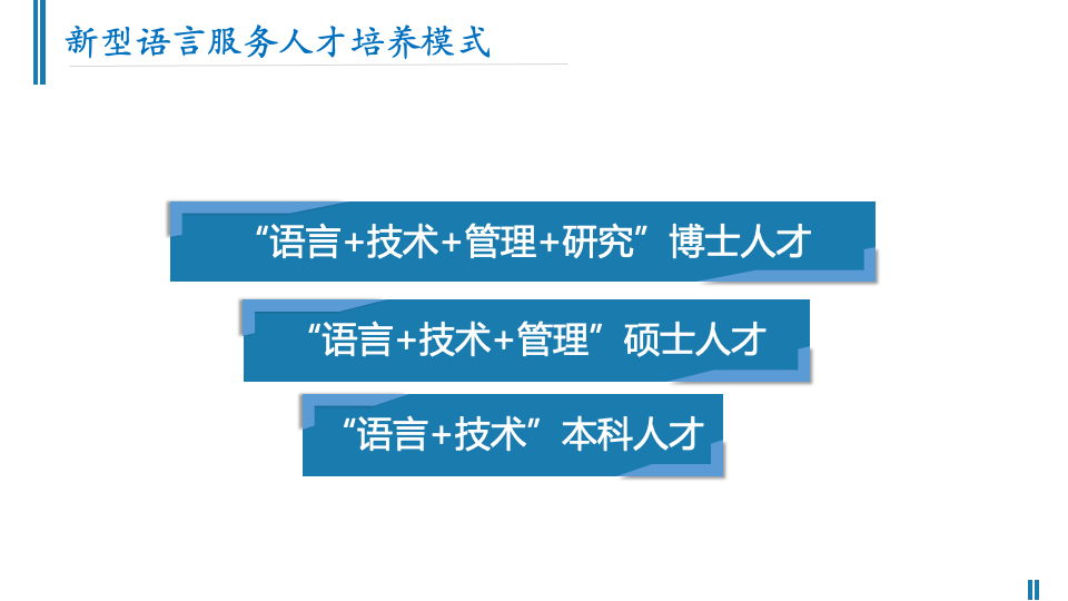 我们的人才培养模式可以从三个层级来向大家介绍,一个层级是我们的语言加技术的本科人才,在我们2015年到现在的培养的模式里面,我们不仅会教翻译专业的本科生如何去学习听说读写译,我们还会教他们怎么去使用新的技术,而且是核心的技术。而当这些本科生经过了四年的培养之后,进入到我们的研究生的阶段,我们还会给他们教授一些管理的技能,而当他们进入到我们的博士阶段了之后,我们还会让他们进入到行业,去研究行业发展的趋势。在这样的一个本硕博的培养模式里面,我们采取了一系列的新的课程的改良和创新。