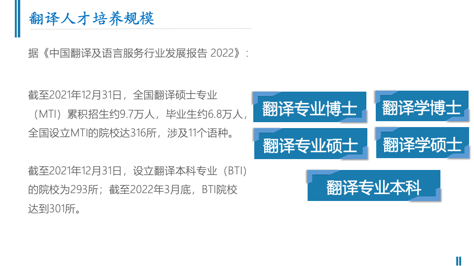我们来看一下,根据中国翻译及语言服务行业发展报告,截至2021年的12月31日,全国培养翻译专业硕士的学校已经累计培养了9.7万,将近10万人,毕业生有6.8万人,这些学校的总数已经超过了300所,涉及11个语种,而在本科阶段,我们已经有301所学校开设了本科的翻译专业。