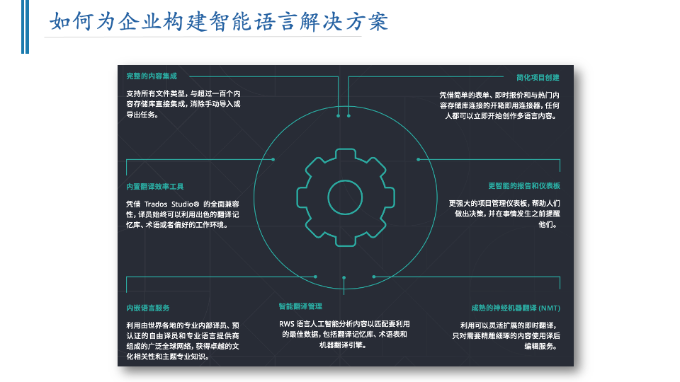 现在这样的系统已经在越来越多的企业里面来得到推广,这些系统它的核心的能力是什么呢?我想可以通过这样的几个方面来去展现这样的一个解决方案的核心技术的能力。比如说内容分析器,比如说翻译记忆库,比如说术语管理,还有大家非常关注的机器翻译,还有内容连接器、文件筛选器、自动化的工作流,还有报告仪表板。这些语言技术似乎离我们传统的翻译学习很远,谁会去关注如何将不同类型的文本都统一的集成到一个系统里面,来进行分析和管理?有多少人会去关注,将企业积累了那么久的双语的资源,管理到自己的翻译记忆库里头?有多少的企业或多少的人会去关注,怎么把机器翻译纳入到自己已有的系统里面,去降本增效,让机器翻译应用于实际的语言服务需求的解决过程之中?又有多少人会去关注将整个业务流程中所使用到的这些数据,都能够通过统一的仪表板或者是面板来可视化的展现出来?