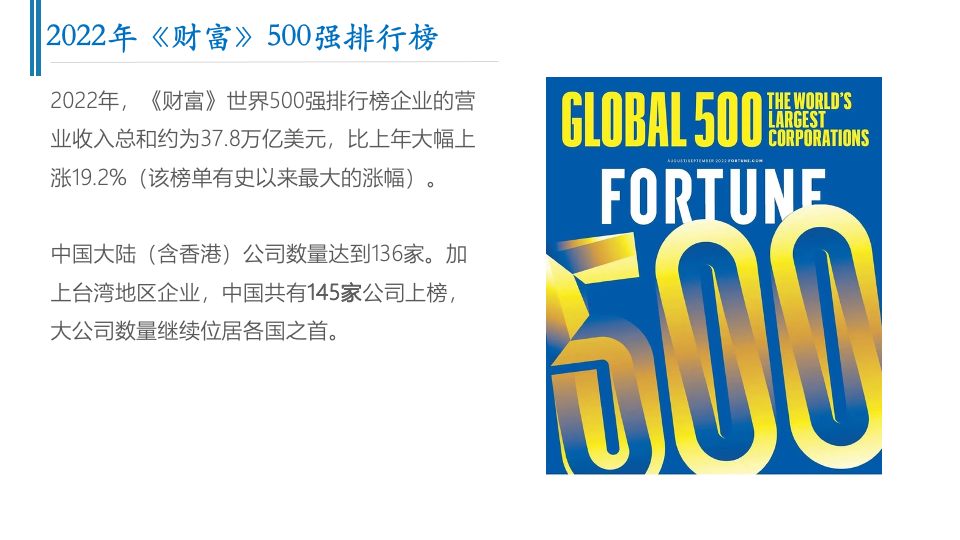 我们首先来看一下2022年财富500强的排行榜,2022年财富世界500强排行榜企业的营收收入总和约为37.8万亿美元,比上年大幅度上涨19.2%,是这个榜单有史以来最大的涨幅。而在这个榜单中有多少中国的企业正在贡献这样的一个涨幅?中国大陆包括香港公司数量达到了136家,如果我们加上台湾地区的企业,中国共有145家公司上榜,所以在这样的一个规模上已经位居各国之首了,所以可以看见中国企业出海的势头是非常强劲的。