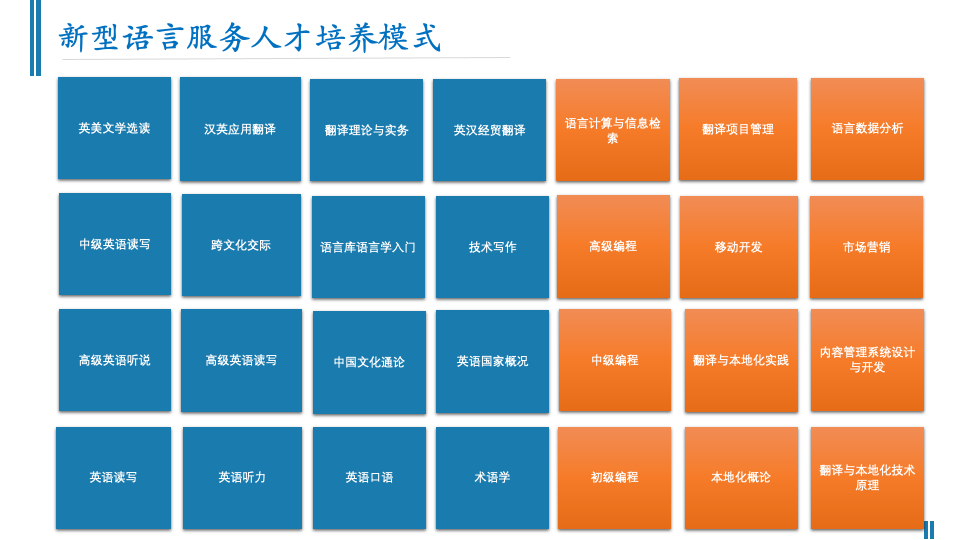 大家在这样的一个图里面的左侧可以看见,这是我们偏文科的课程设置,而在右侧的橘黄色的这一部分是我们偏理科的课程设置。时间的关系,我没有办法向大家详尽的介绍每一门课程我们都在讲什么,但是我不妨举几个例子,让大家可以感受到我们人才培养的模式是如何根据语言服务行业发展的趋势,和我们的企业出海的需求相结合的。比如说我们可以看内容管理系统设计与开发,在前面我们谈到了很多内容管理系统,无论是我们的出海的企业拥有自己的内容管理系统,还是提供语言服务这样的一个解决方案的乙方,或者说我们供应商也有自己的内容管理系统,所以如果我们的学生在本科阶段就能够了解到一个内容管理系统是怎么设计和开发出来的,当他参与到企业的实际的业务流程中的时候就并不会觉得陌生。