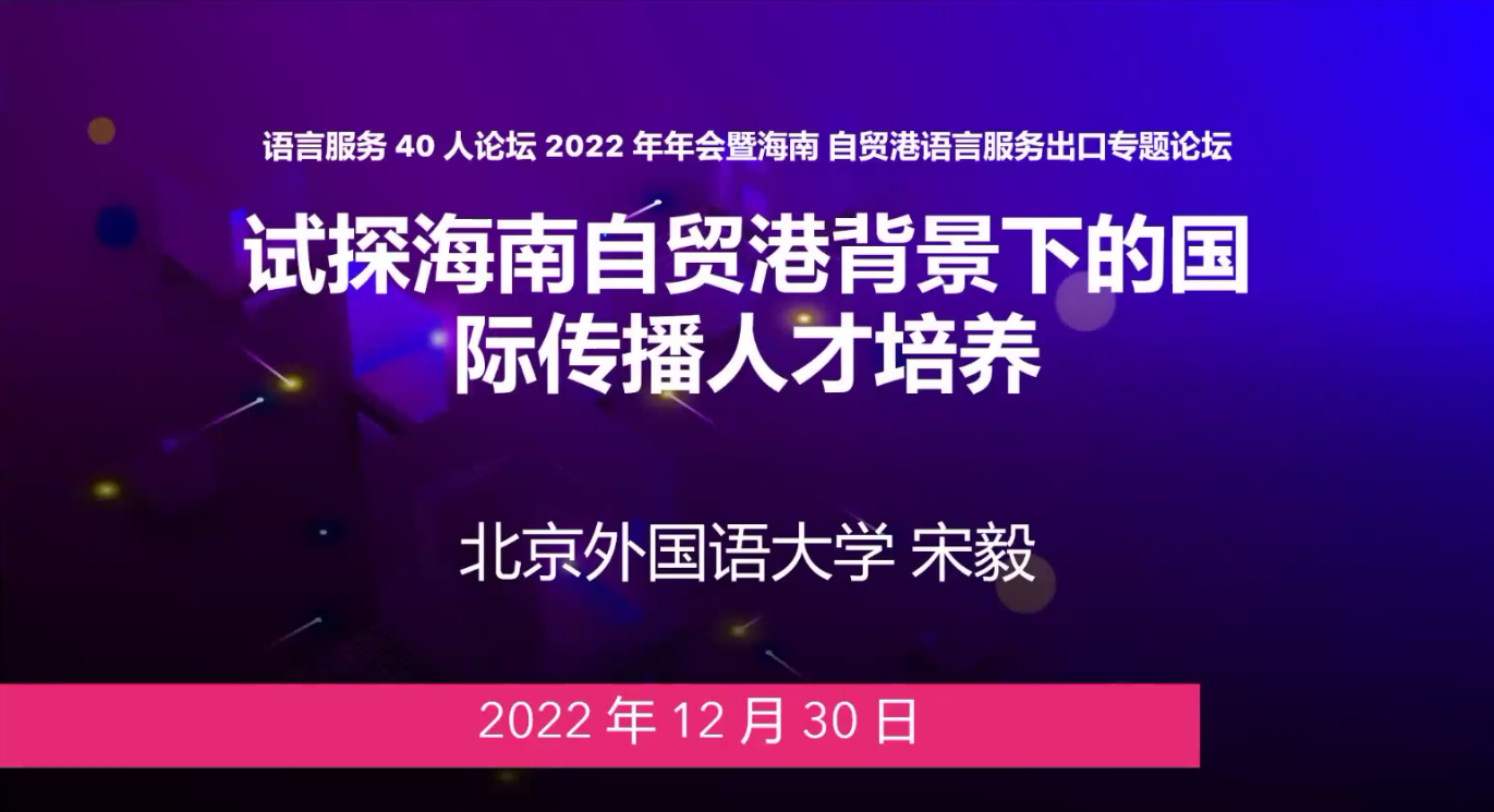 2022年12月30日,语言服务40人论坛2022年年会暨海南自贸港语言服务出口专题论坛于线上顺利举办。此次论坛由语言服务40人论坛、海南师范大学国际语言服务学院、北京语言大学国家语言服务出口基地联合主办,由北京语言大学国际语言服务研究院、海南师范大学外国语学院、新译信息科技(深圳)有限公司国家语言服务基地、北京语之服科技有限公司、河北民族师范学院语言服务研究所、中国对外贸易与经济合作企业协会商务英语专业委员会、中国人民大学出版社、对外经济贸易大学出版社、中国网文化科技金融融合(海南)示范基地、海南外语协办,通过语言服务40人论坛视频号和译直播进行全网直播,全网约1万人次观看直播。