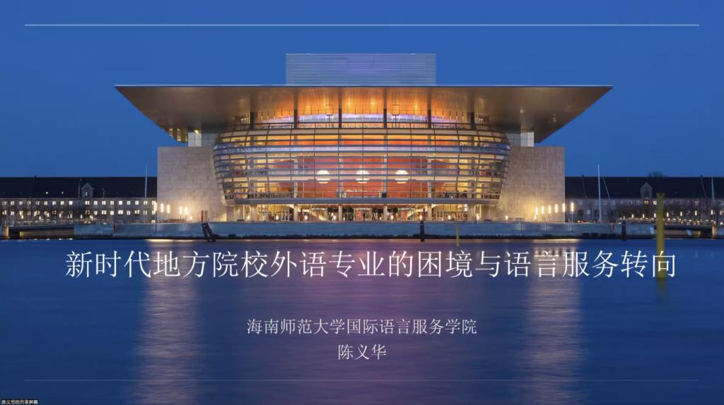 海南师范大学国际语言服务学院院长陈义华教授进行就“新时代地方高校外语专业的语言服务转向”发言,梳理了地方高校外语专业的发展困境,对地方高校外语专业语言服务转向改革路径提出意见建议,并以海南师范大学为例,展示了地方高校语言服务转向的基础设施建设与成效。
