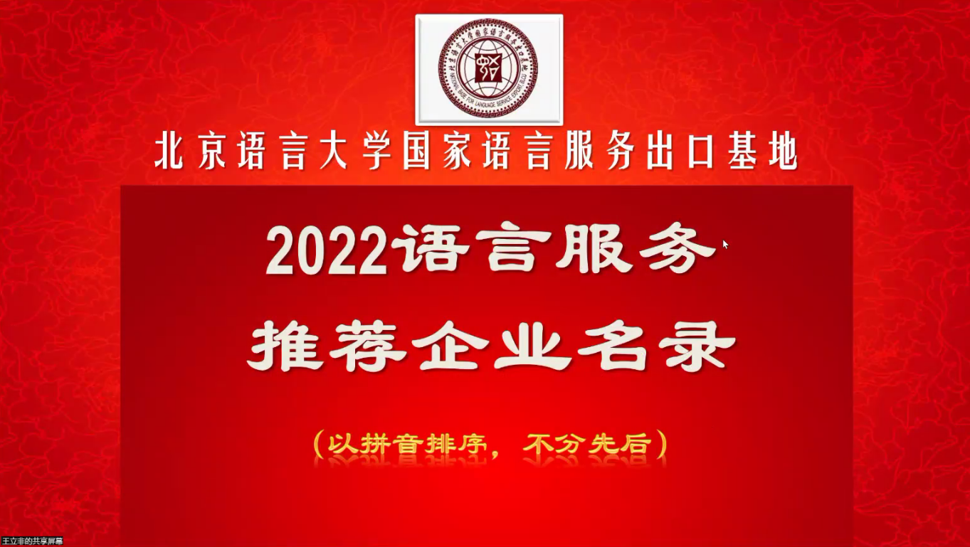 北京语言大学国际语言服务研究院院长王立非教授发布2022年语言服务推荐企业名录,根据2022年CSA Research语言服务咨询公司发布的中国语言服务企业排行榜的入选指标,同时参考商务部等对特色服务出口基地(语言服务)评选条件,综合考虑其他因素后,遴选出22家“2022语言服务推荐企业”。