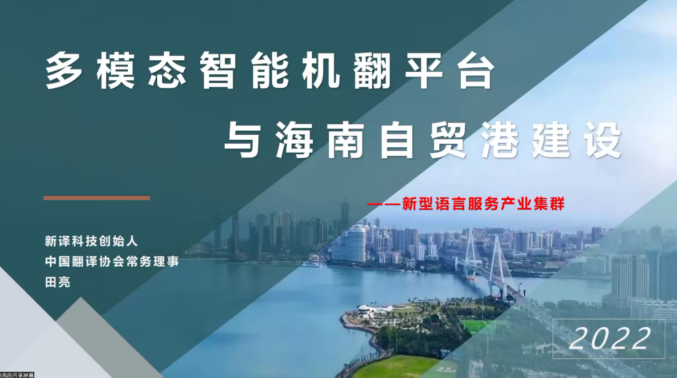 新译信息科技(深圳)有限公司田亮董事长就“智能语言服务助力海南自贸港建设”进行演讲,从新型语言服务产业集群的角度,介绍语言服务行业产业发展现状,提出海南自贸港建设对语言服务存在巨大需求,关于海南发展智能机翻推动语言服务产业发展提出五点建议,并表示新译科技可以为海南的发展提供有力支撑。