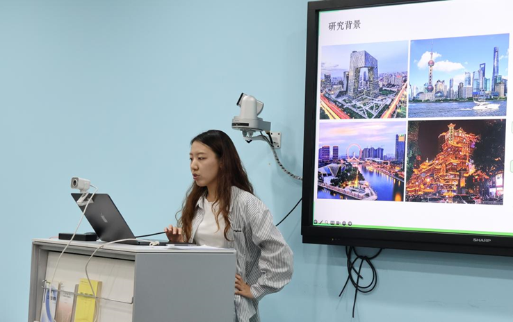 首先,作为第一组,张晋如同学率先上场,汇报了语言治理与智能翻译相结合的论文选题,构建了相应的指标评价体系,并基于该体系进行实际应用。因研究框架完整、论证严密,受到老师们的高度肯定。老师们认为该研究对于提升语言服务水平具有重要现实意义,并建议进一步优化具体的指标选取,扩大研究样本,丰富评价体系,以提升其学术应用价值。